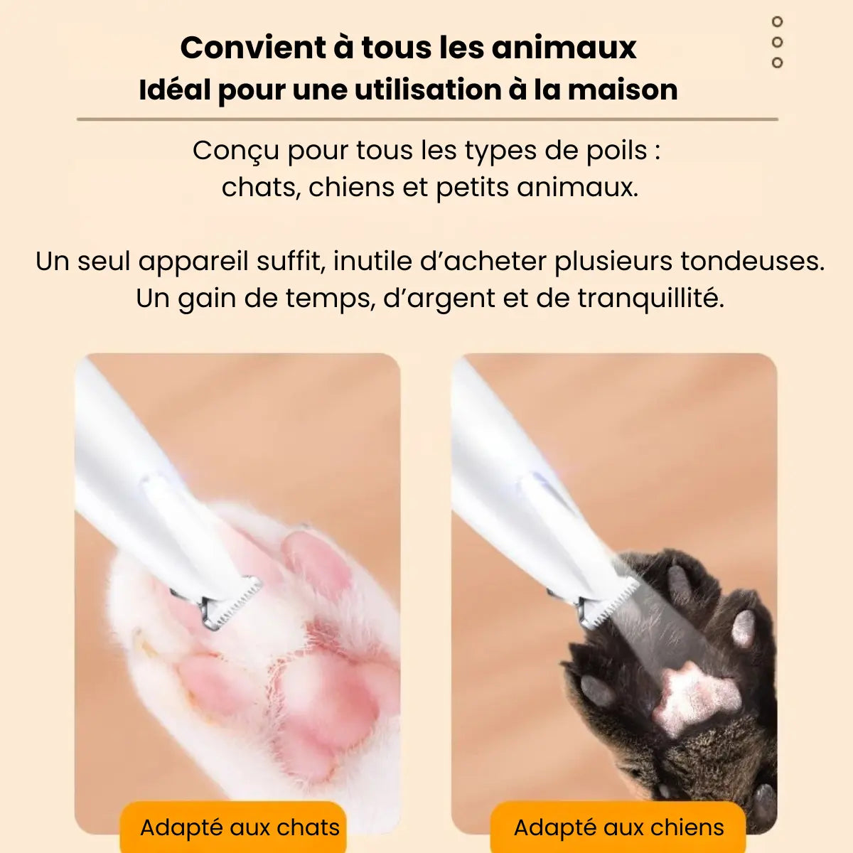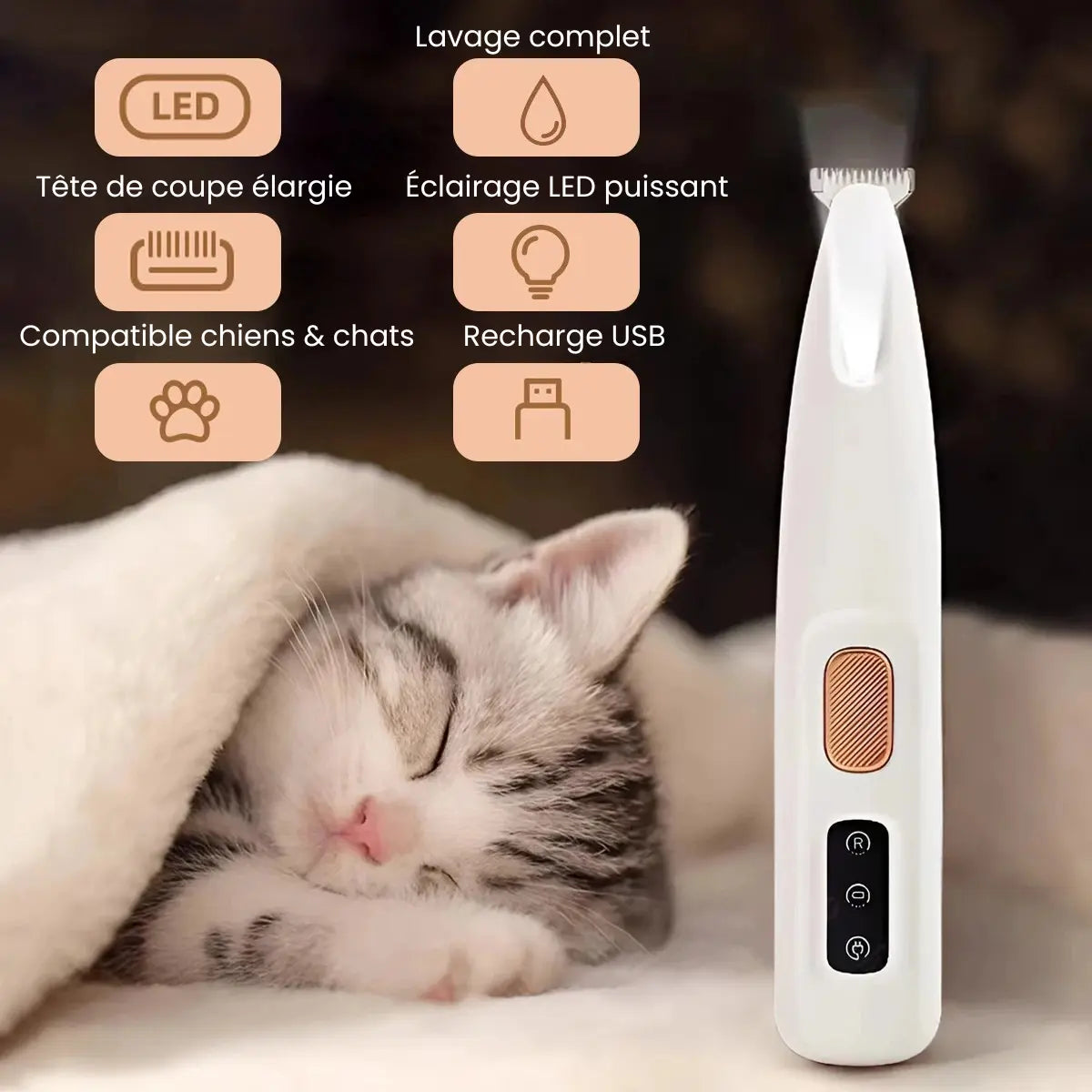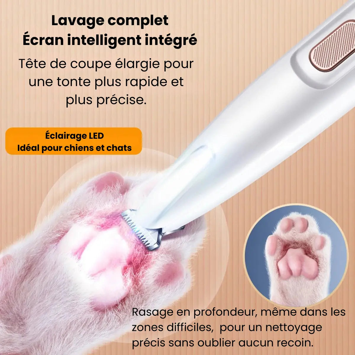 Une précision douce et maîtrisée pour chaque zone sensible. Un toilettage clair, sécurisé et sans stress, même pour les animaux les plus délicats.